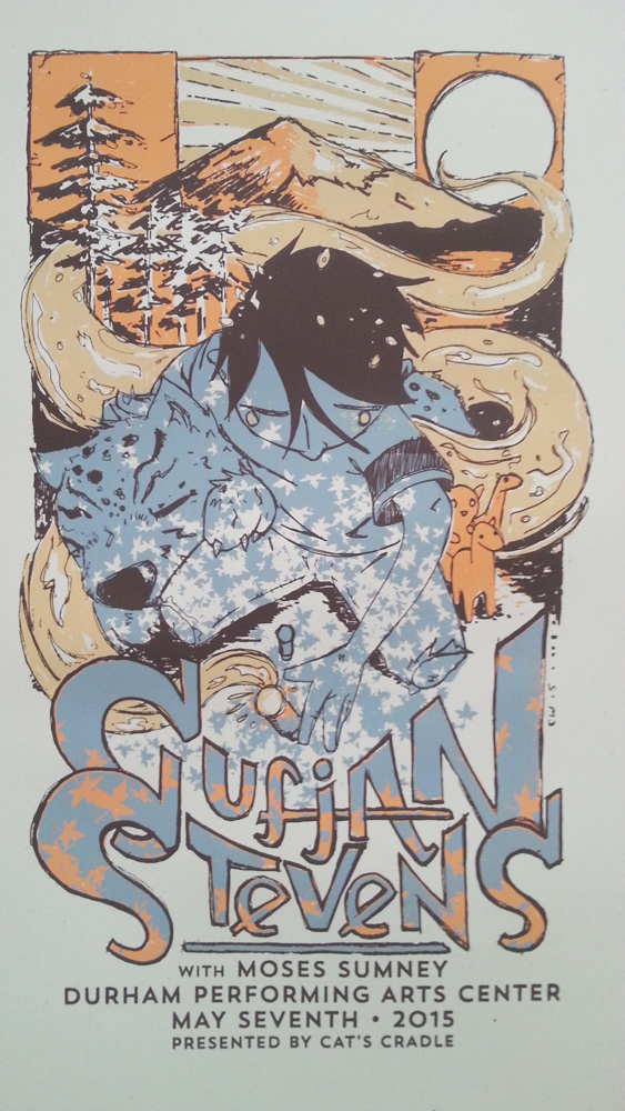 Print for Sufjan Stevens at DPAC. Four screens on cover stock. Measures 13" x 21.5"