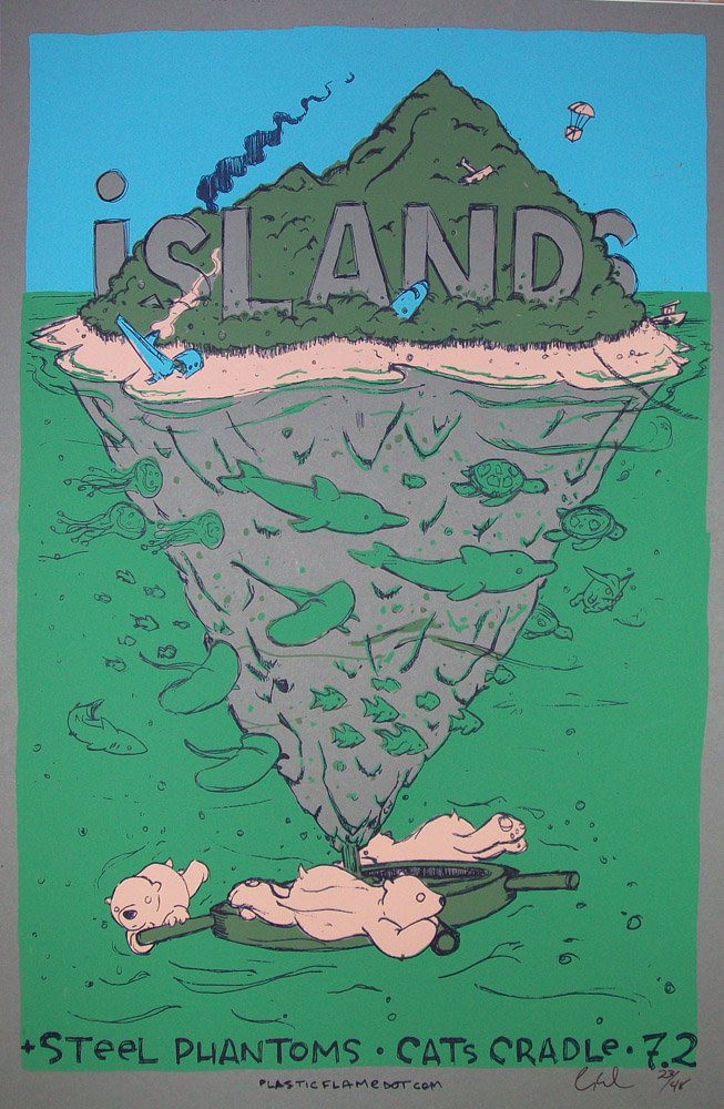 Poster for Islands at Cat's Cradle in Carrboro, NC. A plane crash, polar bears, a donkey wheel, shark, etc. I liked a show apparently.