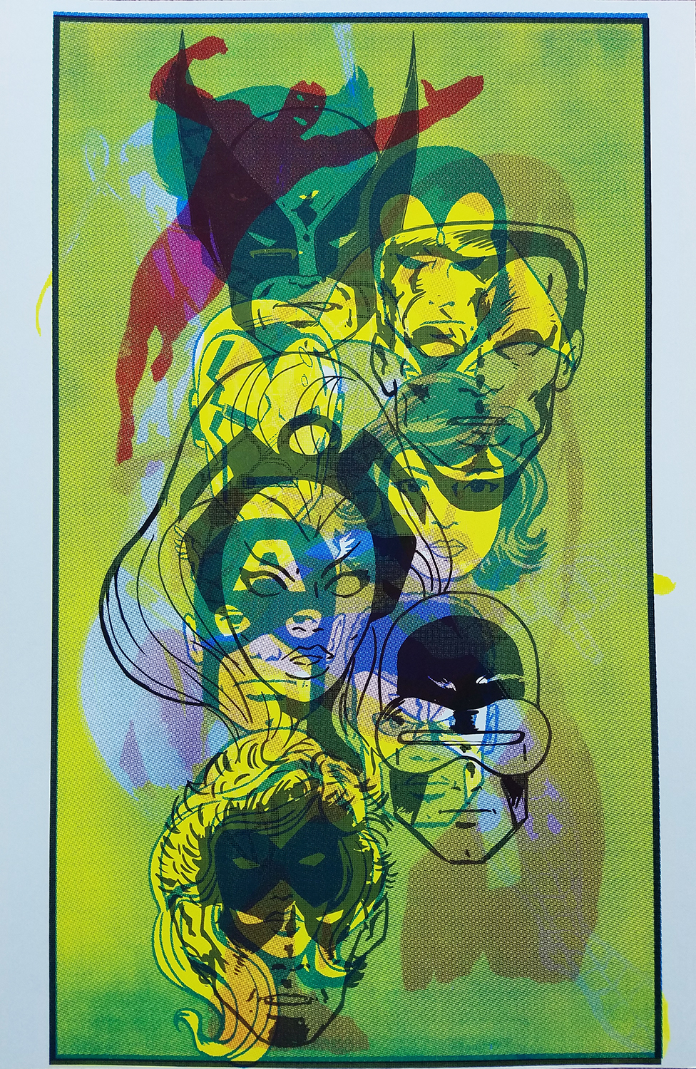 One of a kind print using screens from four different corner box prints. Four screens on cover stock. Measures 12" x 18"