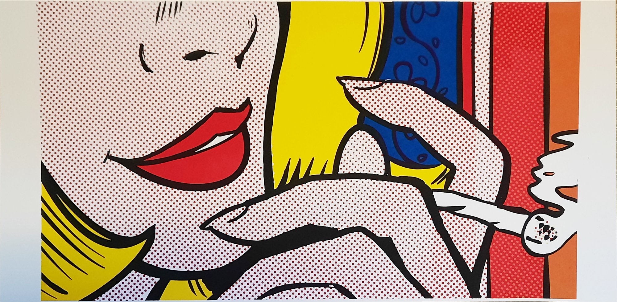 In the style of Roy Lichtenstein, a shot of a woman enjoying a smoke.