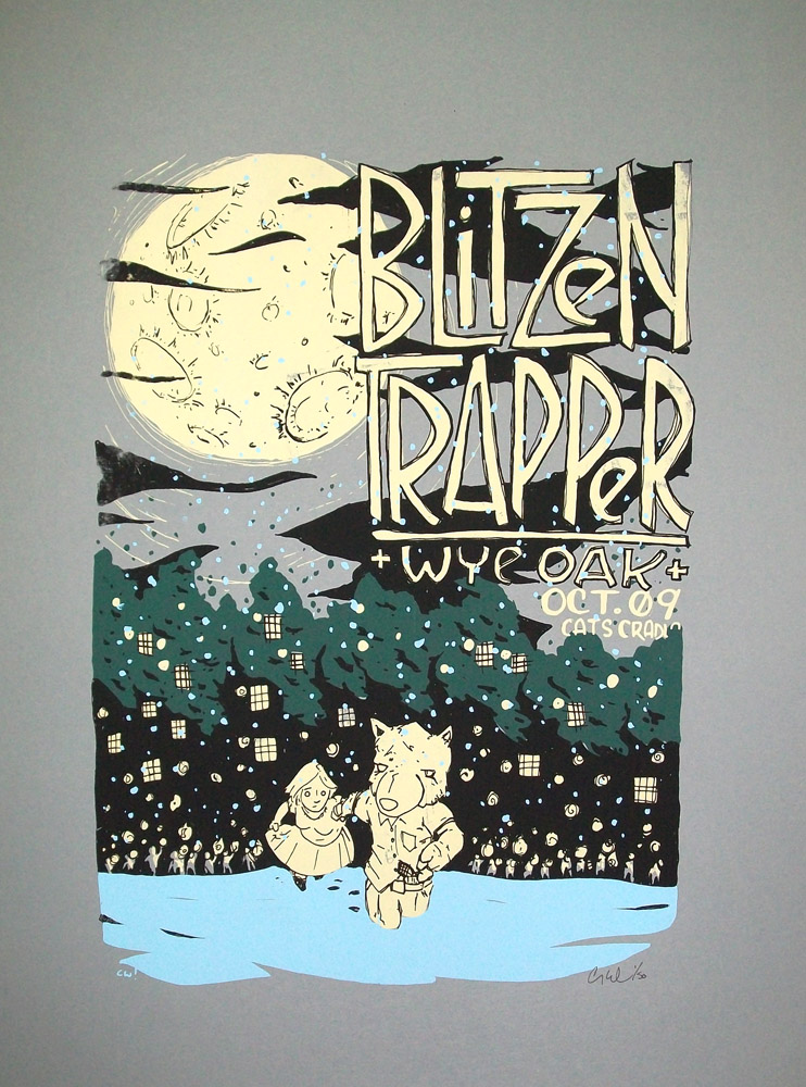 Poster done for the Blitzen Trapper show at Cat's Cradle, in Carrboro, NC. Wolf-guy, on the run, dame in tow, gun in belt, townfolk in pursuit. Plus, a gigantic moon. I mean, really, that moon is huge. And windows in trees.