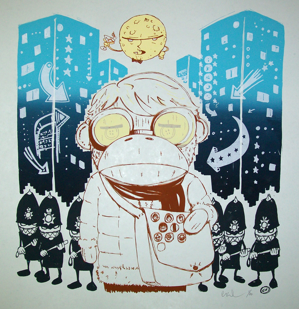 This poor sock monkey, full of vice, just trying to live a normal life. If it wasn't for the temptation of night, maybe the coppers would stay off his tail. What's a sock to do?