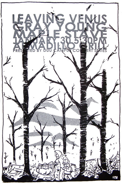 Poster for Leaving Venus, Grey Young and Maple Stave at Armadillo Grill at Duke University in Durham, NC. Based on Cormac McCarthy's 'The Road.'