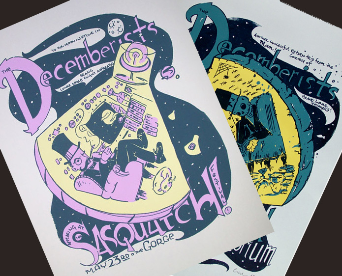 Posters for the Decemberists at the Sasquatch Fest and at Memorial Auditorium in Raleigh, NC.